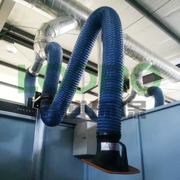 實訓室排煙系統(tǒng)現(xiàn)場所需除塵的工位共包含20個焊接工位,每個工位煙塵收集采用一套2.5m長萬向吸氣臂的形式。吸氣臂規(guī)格:φ150mm*2500mm每條支管道配套一個手動風閥;
