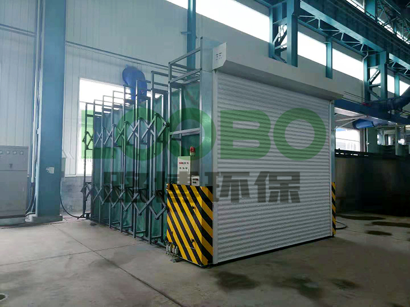 曲臂車間有2臺機床式火焰切割機,手持式火焰切割機1臺,兩臺機床式火焰切割機工位共用一個平臺,滑軌長28米,懸臂有效伸縮長度4米。應企業(yè)要求,路博將機床式火焰切割除塵工位設計為5米長的移動式除塵房,手持式火焰切割工位采用可伸縮式除塵房,伸縮房伸長后6米,收縮后2米,門高2.6米,系統(tǒng)風量為72000m3/h.