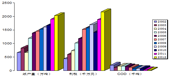 圖一??2002-2012年山東省造紙行業(yè)產量、利稅和COD排放量比較示意圖
