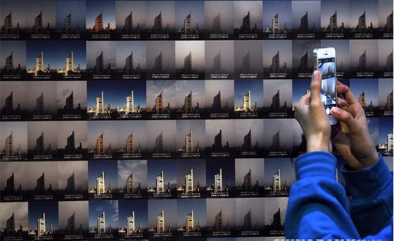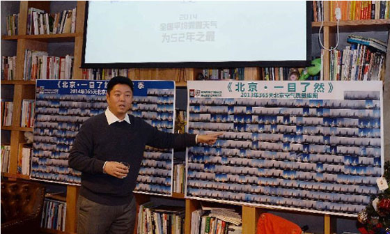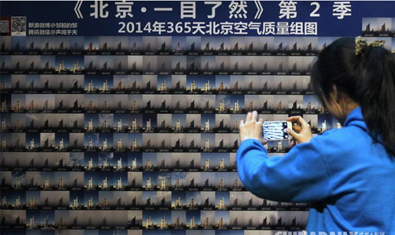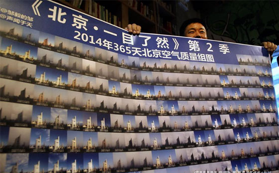 ??????? 這是鄒毅拍攝和拼版的2014年“一目了然”系列照片。鄒毅用2013、2014兩年時間,在同一地點、同一時刻用手機(jī)拍攝照片,記錄天氣變化狀況,并將兩年拍攝的700余張照片按年份匯總在一起,希望通過直觀的影像反映北京空氣質(zhì)量變化,讓更多的人關(guān)注霧霾、關(guān)注環(huán)境保護(hù)。本次分享會是他首次將兩年的拍攝成果一起集中展示。