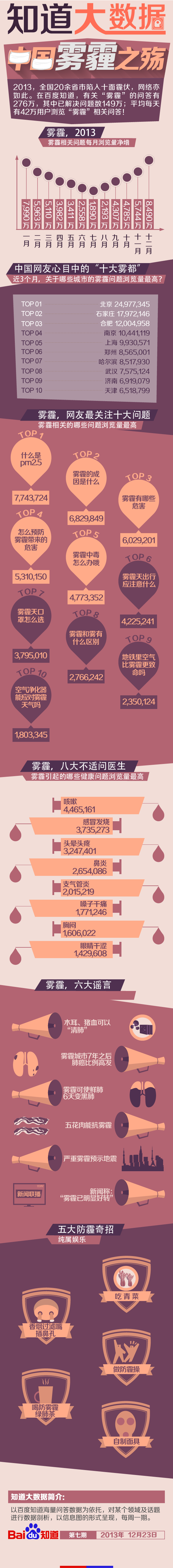 2013,全國(guó)20余省市陷入十面霾伏,“霧霾”成為全民話題!在百度知道,有關(guān)“霧霾”的問(wèn)答有276萬(wàn),平均每天有42萬(wàn)用戶瀏覽“霧霾”相關(guān)問(wèn)答!知道大數(shù)據(jù),盤點(diǎn)中國(guó)網(wǎng)友心目中的“十大霧都”,粉碎霧霾六大流言!對(duì)了,你今天吃青菜了嗎?
